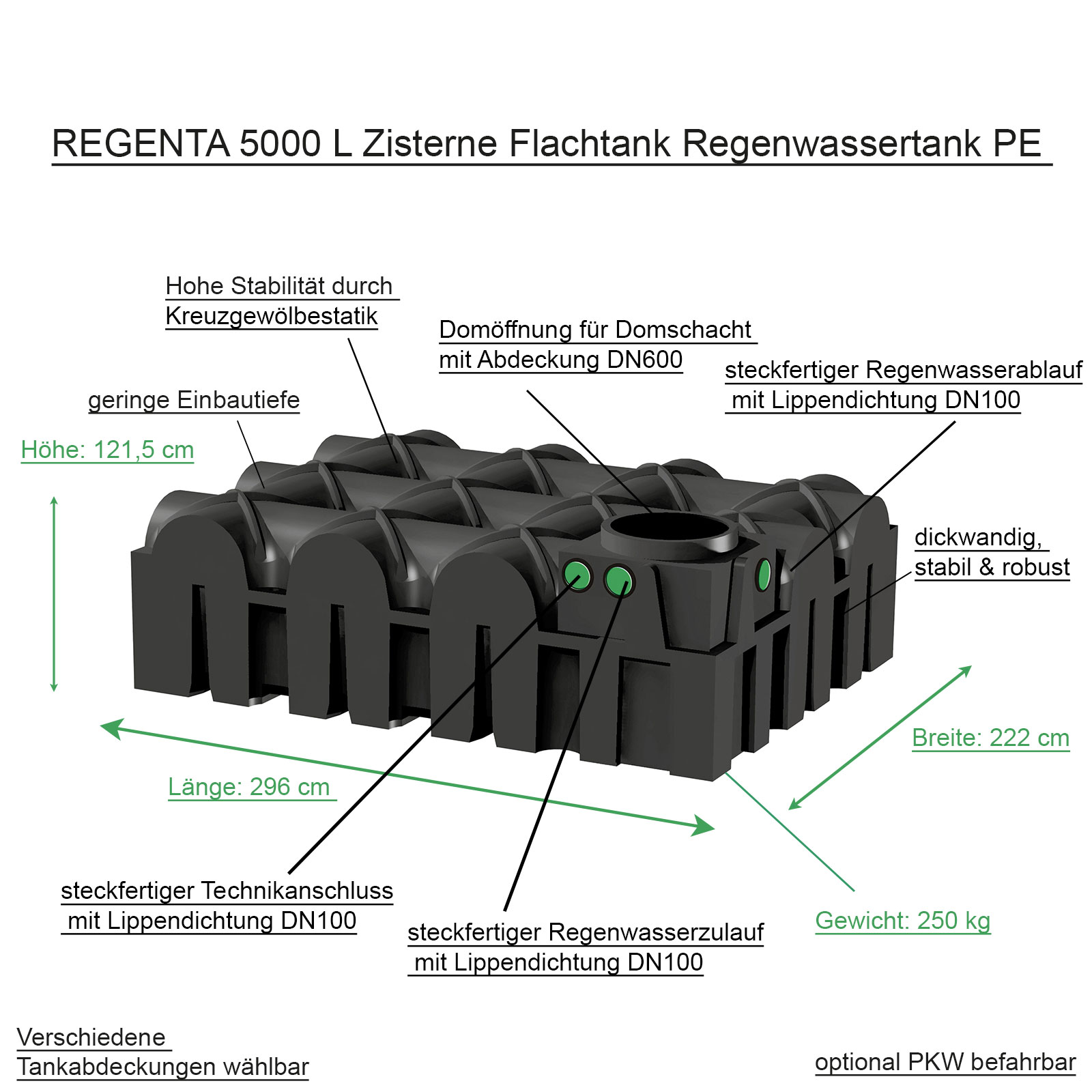 Art.-Nr.: AKF5099Der Regenta Flach speichert bis zu 5000 Liter Regenwasser bzw. Wasser. Der Regenta Flach benötigt bei 5000l Regenwasser lediglich eine geringe Grubentiefe. Der Regenta mit seinem Volumen von 5000 Liter eignet sich bestens für einen großen Garten. Bitte wählen Sie die gewünschte Schachtabdeckung bzw. Tankdeckel für Ihren Regenta aus.