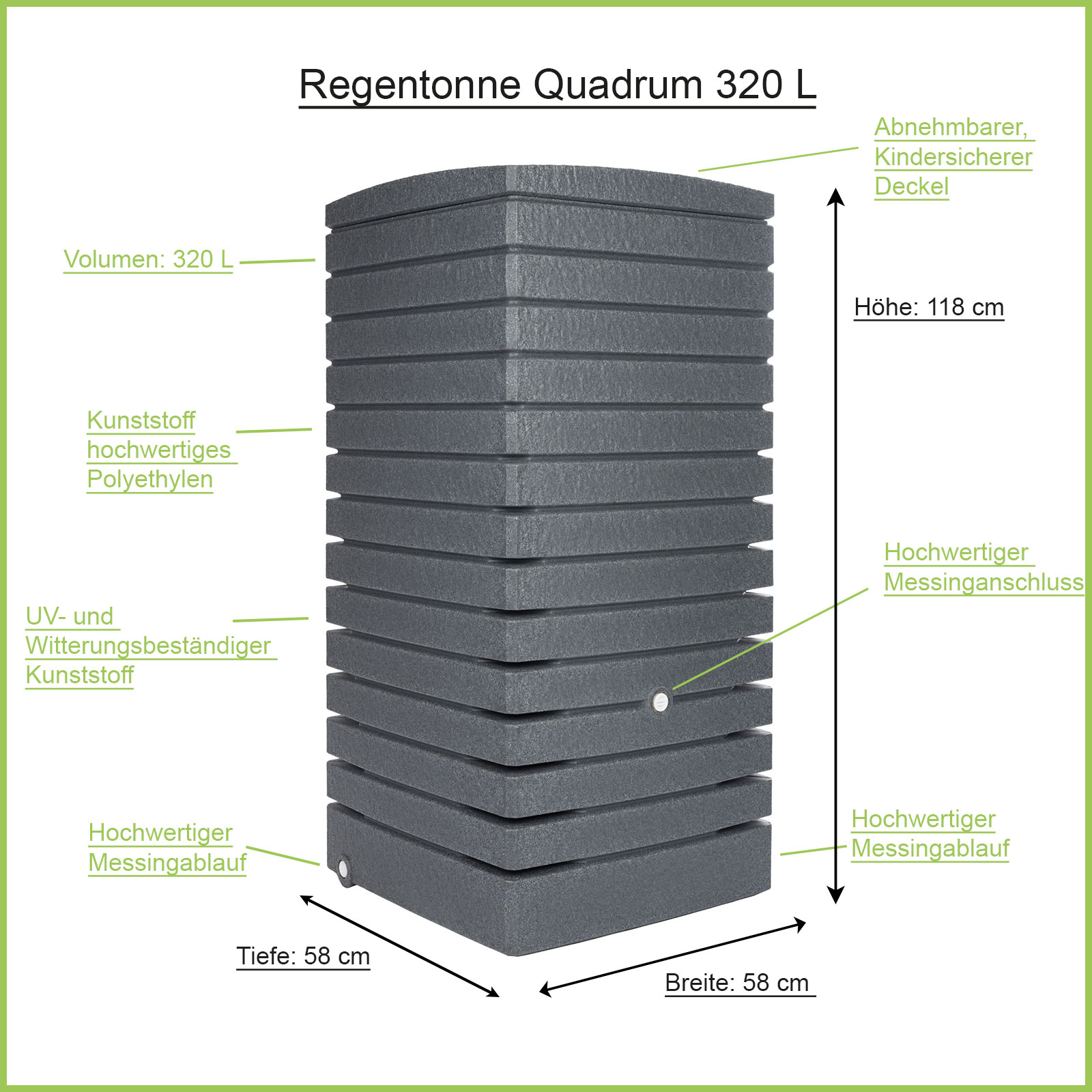 Art.-Nr.: F900200Die Regentonne Quadrum ist ein eckiger Wandtank in Steinoptik. Die Regenwassertonne in edlem Granit Mauerstein Design speichert 320 Liter für Garten und Terrasse. Mit Abmessungen von 58 x 58 cm lässt sich die Regenwassertonne überall aufstellen ohne viel Platz einzunehmen. Die schmale Regentonne Quadrum hat drei hochwertige ¾-Zoll-Messinggewinde für Wasserhahn, Wasserablauf oder dem Verbinden eines zweiten Tanks.