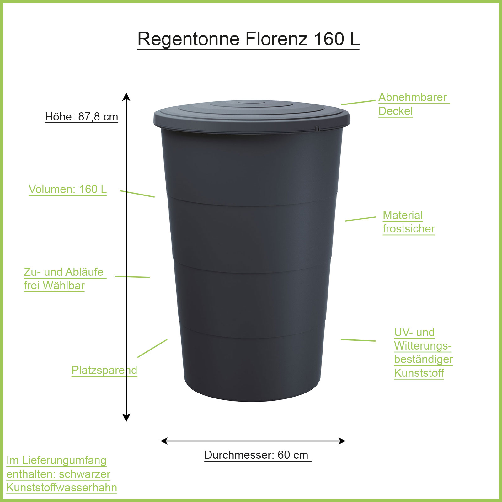 Unsere Regentonne Florenz in der Farbe anthrazit mit einem Fassungsvolumen von 160 Litern. Diese eignet sich bestens für das Bewässern von kleinen Gärten bzw. Terrassen. Der Deckel verfügt über eine Sicherung, die vor unerwünschtem öffnen der Regenwassertonne schützt. Der abnehmbare Deckel ermöglicht es Ihnen das Regenwasser mit einer Gießkanne zu entnehmen. Der Regenwassertank Florenz in anthrazit, lässt sich unauffällig in Ihren bestehenden Garten integrieren und versorgt ihre Blumen bzw. Gemüse mit wertvollem Regenwasser. Die ausgewählte Kunststoffmischung ist sehr UV- und witterungsbeständig, im entleerten Zustand kann selbst die harte bzw. frostige Winterzeit der Regentonne Florenz nichts anhaben. Lassen Sie die alte unschöne Regenwassertonne aus Ihrem Garten verschwinden und freuen sich jeden Tag an Ihrem neuen modernen Florenz 160 l.