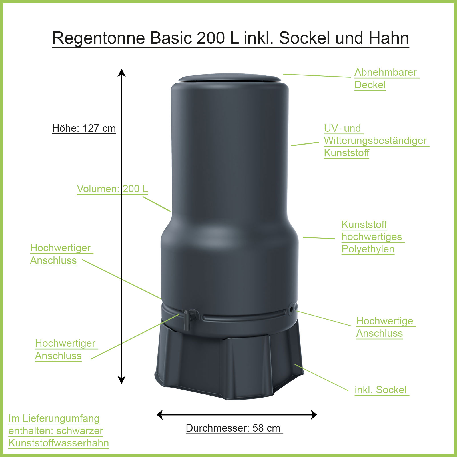 Lieferumfang: Regentonne + Deckel + Sockel + Kst. Hahn schwarz.