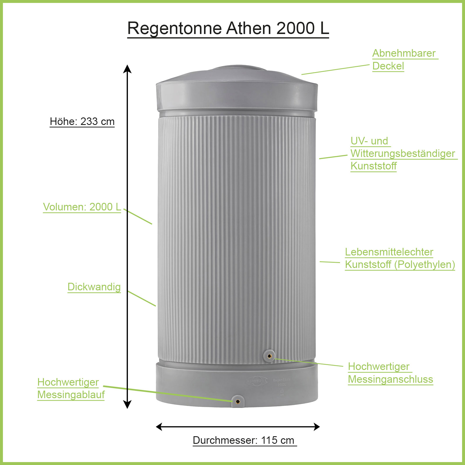 Mit der Akropolis als Vorbild, erinnert die Regensäule Athen an die denkwürdige Epoche der Antike. Mit ihrer schlichten und zeitlosen Struktur lässt sich die Regentonne wunderbar auf jeder Terrasse platzieren. Egal ob als Ergänzung zur modernen Gartengestaltung oder in Kombination mit Natursteinen und Kletterpflanzen für das mediterrane Flair. Der Säulentank Athen 2000 Liter wird aus hochwertigem Kunststoff (PE) gefertigt und ist dank hoher Wandstärken bestens vor Wind und Wetter geschützt. Mit einem Volumen von 2000l speichert die Säulen Regentonne genug Regenwasser für mittlere bis große Gärten. Integrierte 3/4 Zoll Gewinde aus Messing ermöglichen ein schnelles Anbringen von Wasserhahn und Co. Auch das Verbinden mehrerer Regentonnen ist mit unserem Verbindungs-Set jederzeit möglich. Darüber hinaus kann die Regentonne Athen über den zweiten Auslass im Winter sehr leicht entleert werden. Passend für Ihr Zuhause ist die Regensäule Athen in verschiedenen Farben und Größen erhältlich. Steigen Sie noch heute in die moderne und stilvolle Art der Regenwassernutzung um und erfreuen Sie sich bereits in wenigen Tagen am nächsten Regen.