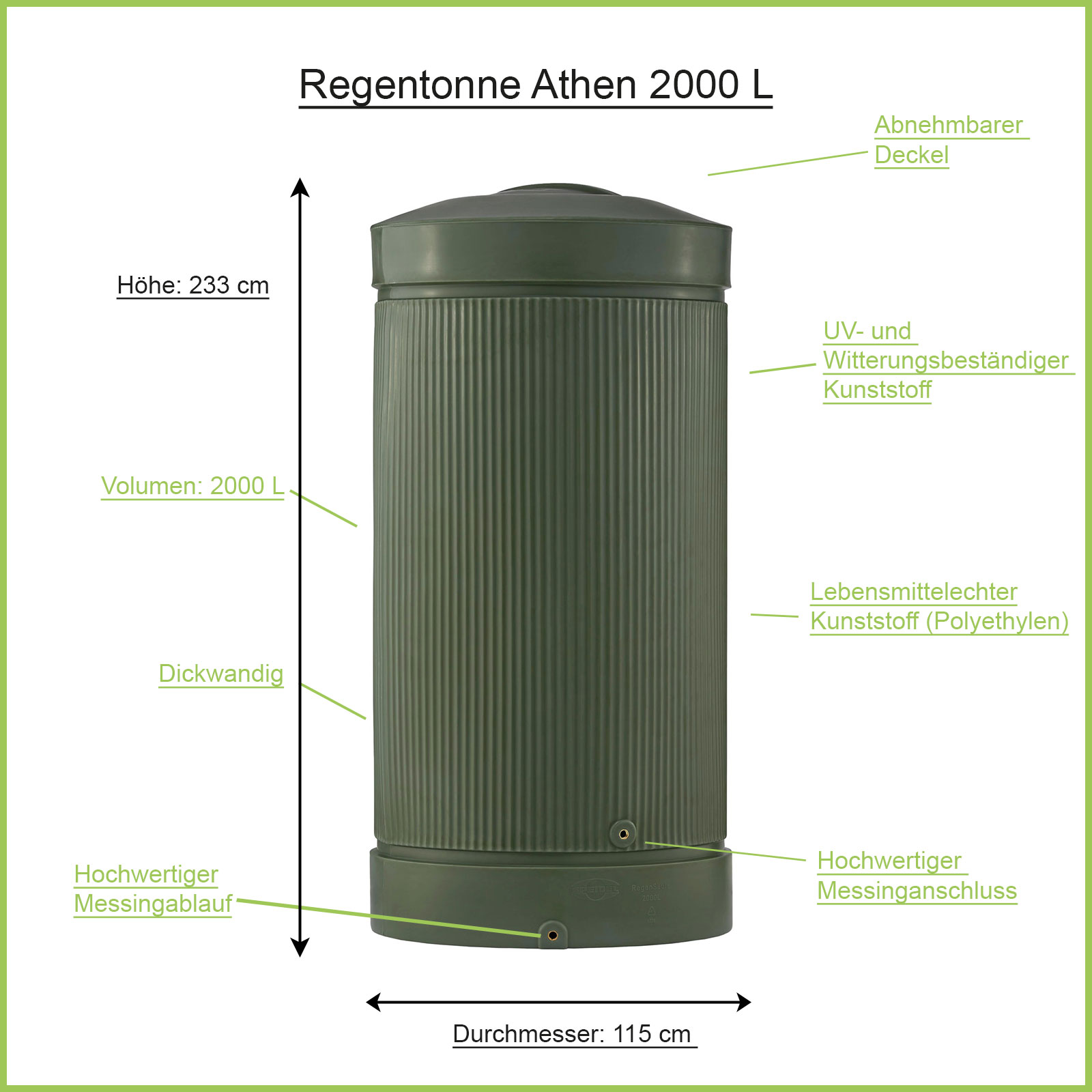 Art.-Nr.: 08083Die Regensäule grün Athen speichert 2000 Liter an wertvollem Regenwasser für die Gartenbewässerung. Dank der innovativen Säulenform nimmt die Regentonne eine sehr geringe Standfläche von gerade mal 115 x 115cm ein. Der Säulentank besitzt zwei integrierte 3/4 Zoll Messing-Gewinde – perfekt für unsere Wasserhähne und weiteres Zubehör. Auch das Verbinden mehrere Säulen für mehr Volumen ist möglich.