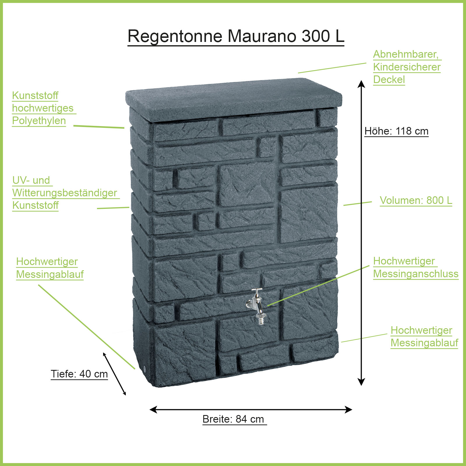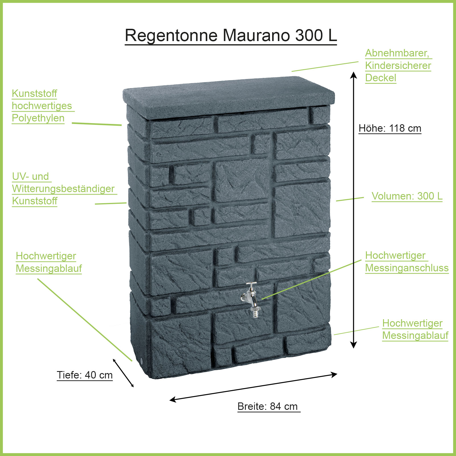 Die Regentonne Maurano anthrazit, ist die perfekte Regenwassertonne für Gartenliebhaber bzw. Gartenfreunde mit einem modernen Garten. Die Regentonne wird aus einem hochwertigen Kunststoff hergestellt, der im entleerten Zustand den kalten Wintermonaten Stand hält bzw. auch dem aggressivem UV Licht trotzt. Die Oberflächenstruktur wurde derart behandelt um die natürliche und Moderne Optik zu erhalten, so das der Regenwassertank einer Steinmauer zum verwechseln ähnelt. In Ihrem Garten lässt sich die Regentonne wunderschön in das Gesamtbild integrieren und wird für Sie und Ihre Gäste ein wahrer Blickfang. Egal ob Sie die Regentonne an der Hauswand, an einem Schuppen bzw. am Gewächshaus aufstellen, sie wird immer die Blicke auf sich ziehen. Die Regenwassertonne lässt sich optional bepflanzen und fügt sich somit noch besser in das Gartenbild ein.