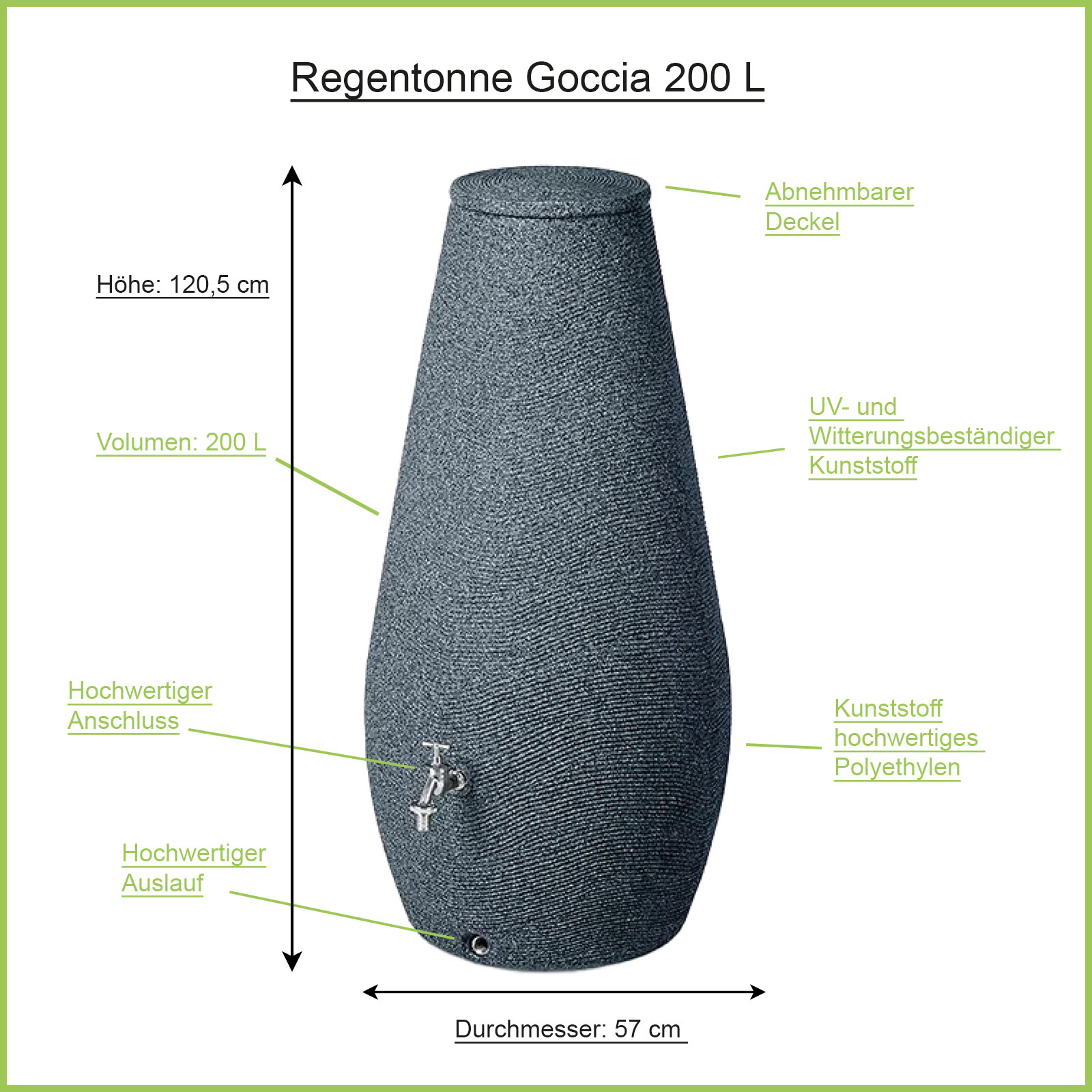 Durch die Verwendung von hochwertigem Kunststoff (PE) ist die Regentonne Goccia beständig gegen extreme Temperaturen und UV-Strahlung. Mit einer Höhe von 120,5 cm und einem Durchmesser von 57 cm hat die Regentonne die perfekte Größe, um sich harmonisch in Ihren Garten einzufügen. Der Regenspeicher verfügt über zwei eingelassene 3/4-Zoll-Gewinde: eines in ca. 30 cm Höhe für einen Wasserhahn und ein weiteres am Boden für den Wasserablauf oder den Anschluss unseres Entnahme-Sets. Mit dieser Regentonne erhalten Sie nicht nur eine praktische Möglichkeit der Wasserspeicherung von 200 Liter, sondern auch ein stilvolles Element für Ihren Garten. Nutzen Sie Regenwasser effizient und umweltfreundlich und werten Sie gleichzeitig Ihre Gartengestaltung auf.
