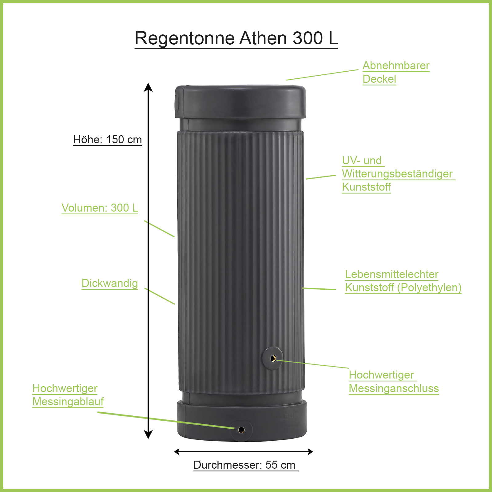 Art.-Nr.: 08334Die Regensäule anthrazit Athen speichert 300 Liter an wertvollem Regenwasser für die Gartenbewässerung. Dank der innovativen Säulenform nimmt die Regentonne eine sehr geringe Standfläche von gerade mal 55 x 55 cm ein. Der Säulentank besitzt zwei integrierte 3/4 Zoll Messing-Gewinde – perfekt für unsere Wasserhähne und weiteres Zubehör. Auch das Verbinden mehrere Säulen für mehr Volumen ist möglich.