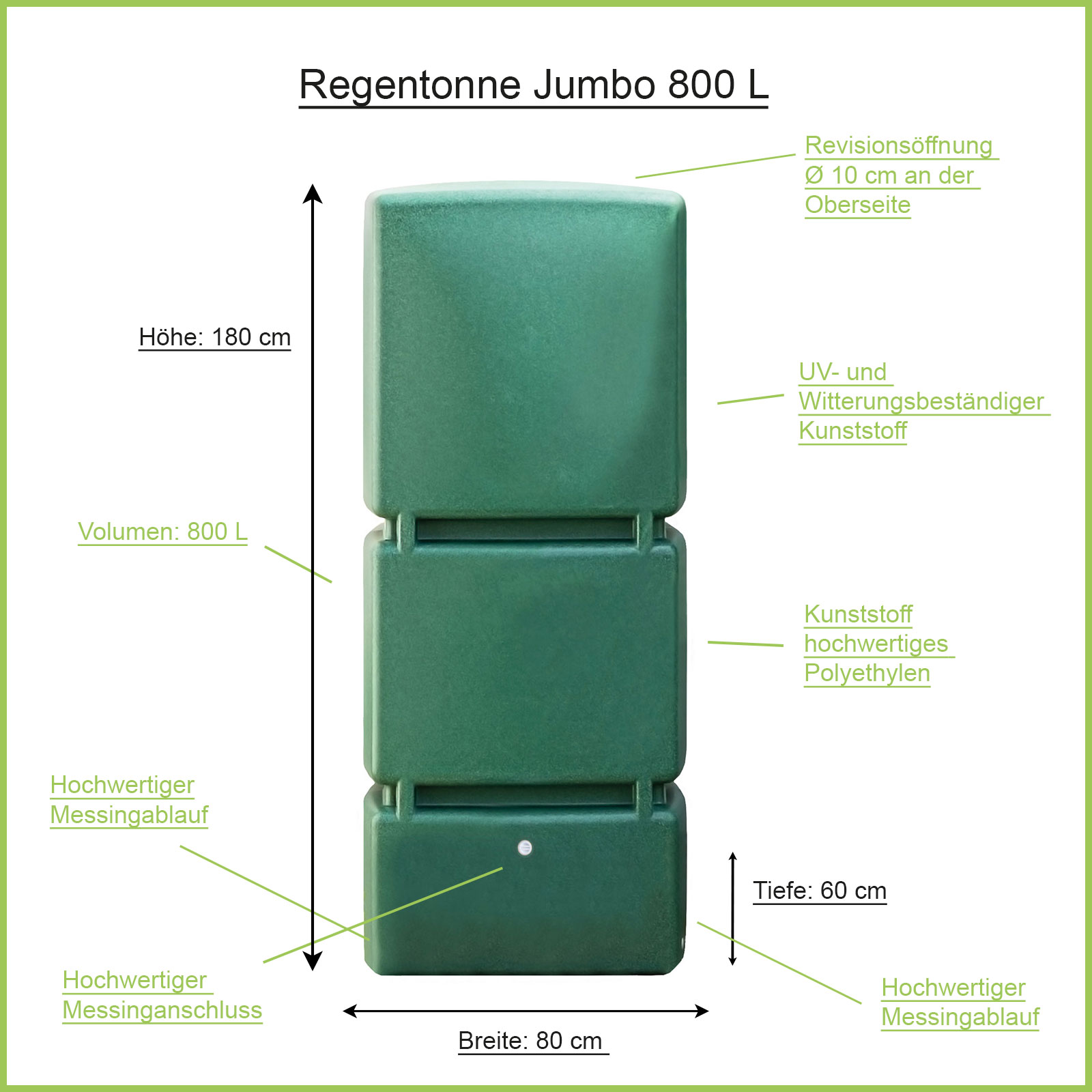 Art.-Nr.: F900110Die Regentonne eckig Jumbo mit 800 liter Volumen für Regenwasser ist ein echtes Platzwunder. Durch die geringe Standfläche von 80 x 60 cm passt die Regenwassertonne an fast jede Stelle in Ihrem Garten. Der Regenwassertank Jumbo ist mit hochwertigen Gewinden aus Messing ausgestattet.