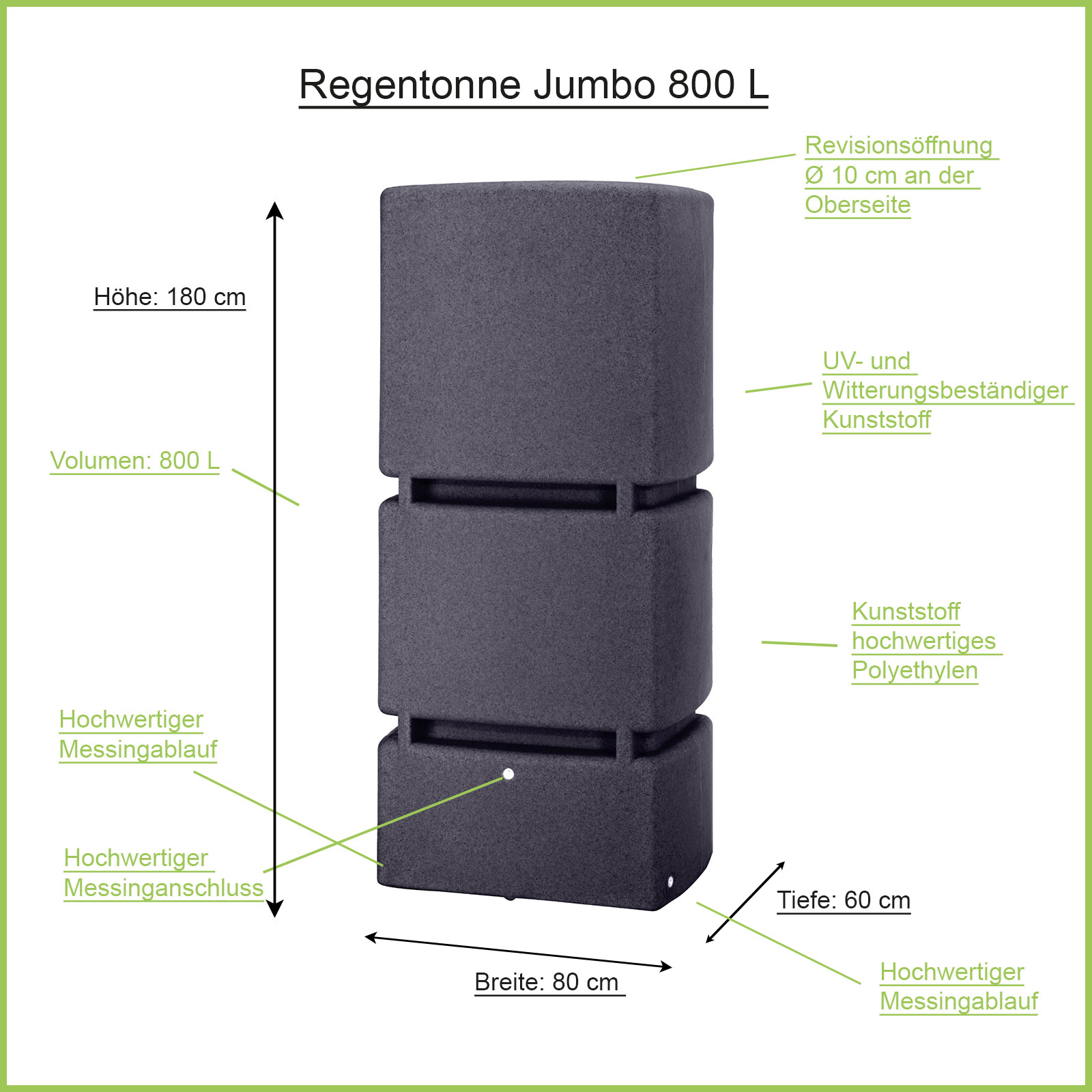 Art.-Nr.: F900120Durch die geringe Standfläche der Regentonne Jumbo von 80 x 60 cm ist sie mit ihren 800 liter Volumen ein echtes Platzwunder. Solche Regenwassertonnen werden durch Ihr großes Volumen auch Regenwassertank oberirdisch bzw. Wandtank genannt. Mithilfe der Anschlüsse links und rechts, knapp über dem Boden lassen sich auch mehrere dieser Regentonnen miteinander verbinden.