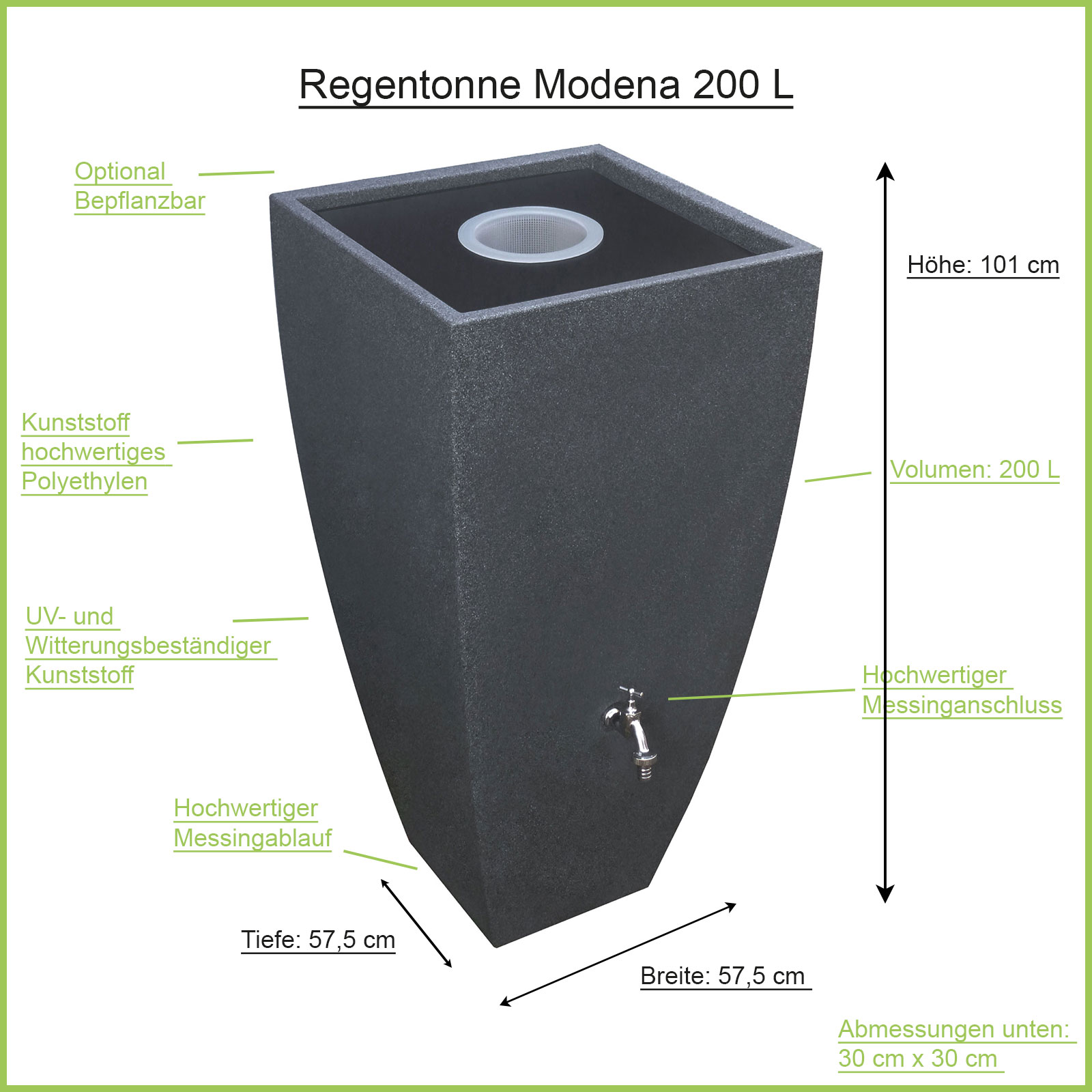 Die Regentonne eckig Modena anthrazit mit einem Volumen von 200l, ist eine moderne bzw. schlichte Regenwassertonne. Sie lässt sich an nahezu jeder Hauswand integrieren. Dieser Regenwassertank besitzt im oberen Bereich eine Kunststoffplatte. In diese ist ein Filterkorb für Regenwasser integriert. Somit können Sie die Oberseite der Regentonne nach Wunsch z.B. mit Kies dekorieren. Durch diese Bauart sind Sie in der Lage, diese Regenwassertonne mit einer klassischen Regen- bzw. Fallrohr Klappe zu befüllen. Selbstverständlich können auch andere Regenwasserfilter z.B. der Regensammler Inox zum befüllen verwendet werden. Für die komfortable Entnahme des Regenwasser kann ein Auslaufhahn angebracht werden. Die Regentonne Modena anthrazit ist äußerst formstabil (hohe Wanddicke von durchschnittlich über 6 mm) und UV-beständig und zudem frostsicher.