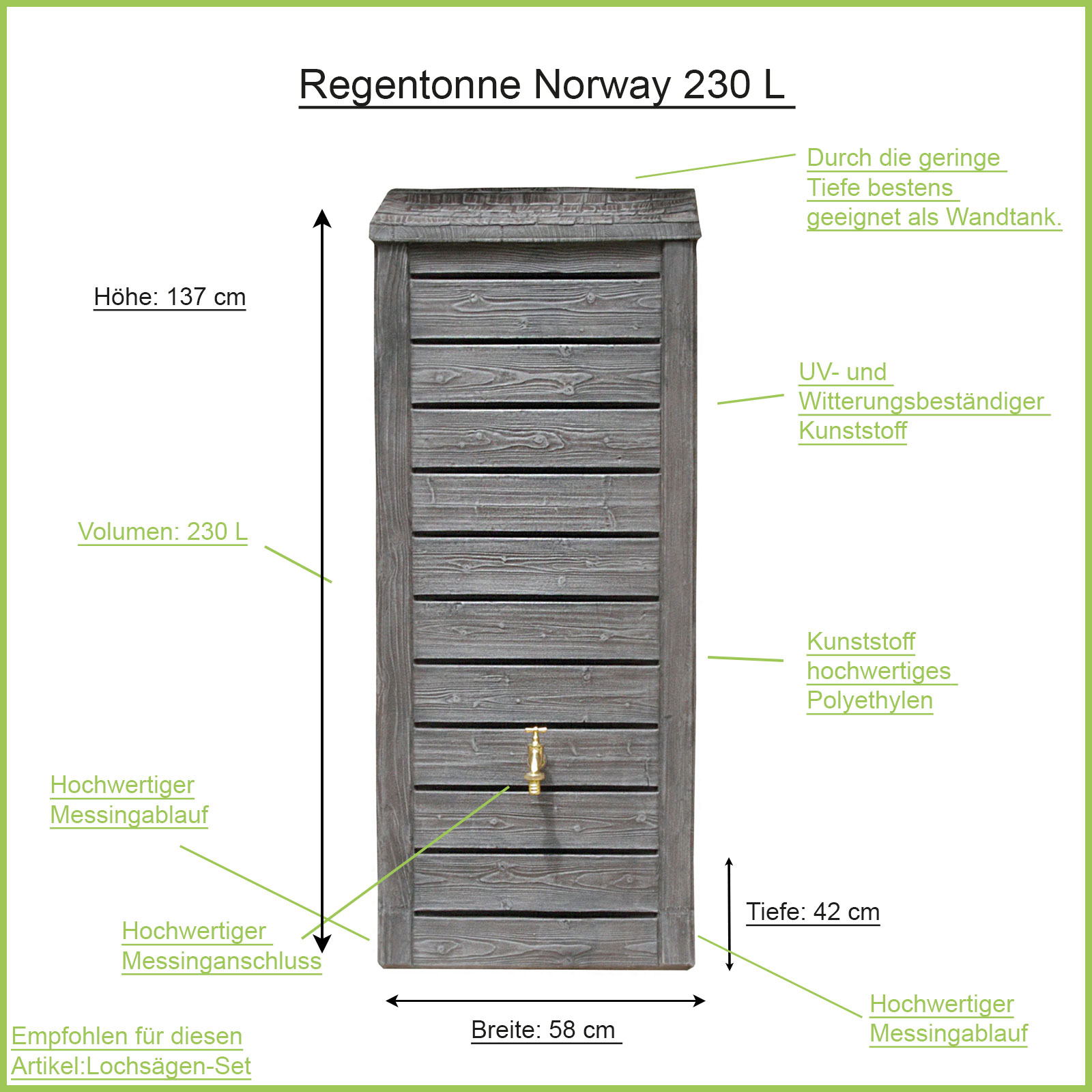 Die Regentonne eckig Norway, ist eine Regentonne für die Liebhaber des skandinavischen, einfachen bzw. rustikalen Lebensgefühls. Das Holz der norwegischen Fichte ist Namensgeber und stand für die Oberflächengestaltung des UV- und witterungsbeständigen Kunststoffs Modell . Durch die abschließende spezielle Behandlung wirkt die Oberfläche der Regenwassertonne täuschend echt. Kaum zu glauben, dass diese alten skandinavischen Holzschindeln in der Lage sind, literweise Regenwasser in Zaum zu halten. Trotz ihres Volumen überzeugt der Regenwassertank durch das besonders schlankes Design. So findet er z.B. auf jeder noch so schmalen Terrasse ihren Platz, sie wirkt eher dekorativ als störend, mehr natürlich als künstlich und scheint bereits einige belebte Jahre hinter sich zu haben.