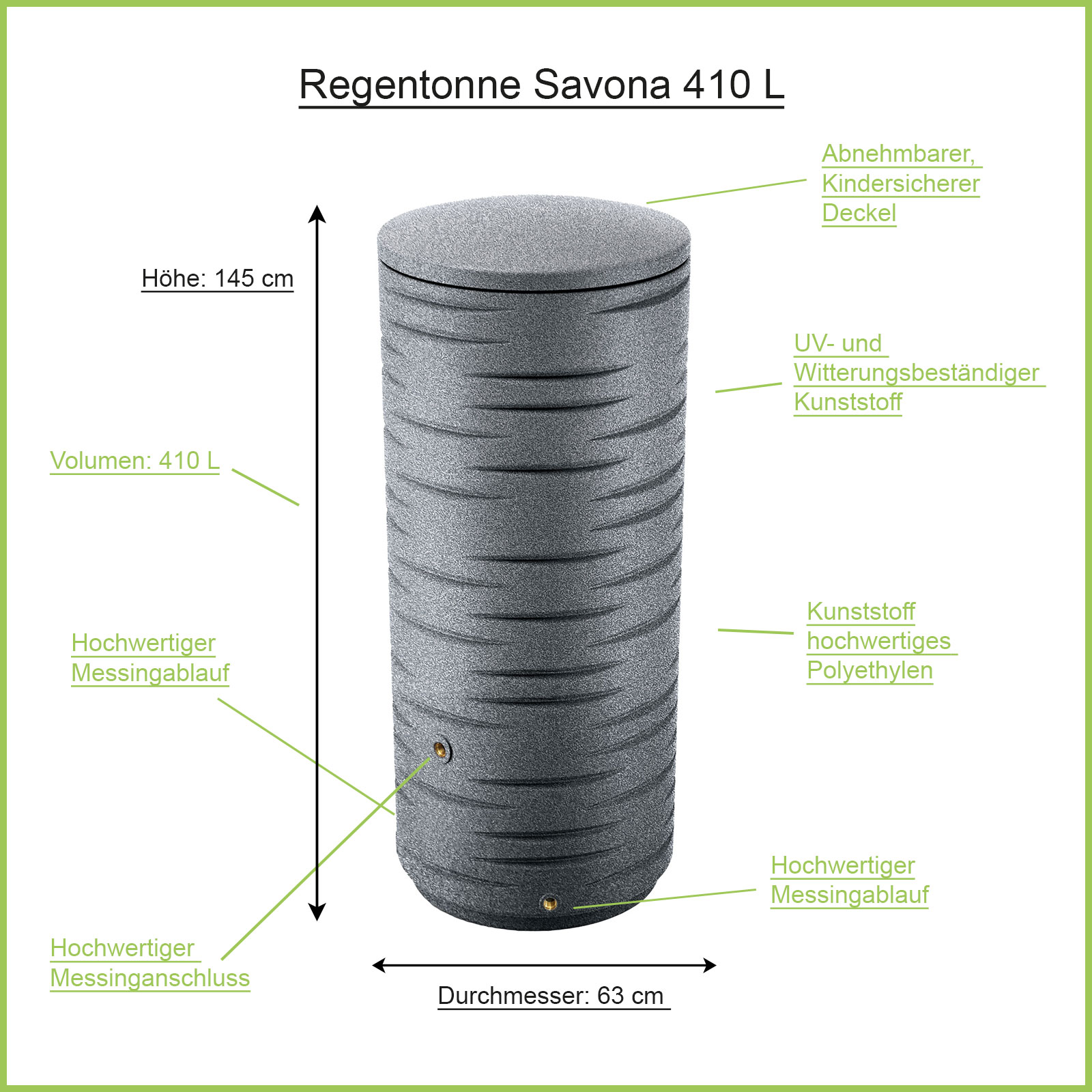 Die Regentonne Savona granitgrau, wird mit ihrer schlichten eleganten Form, neue Akzente in Ihrem Garten bzw. auf Ihrer Terrasse setzen. Ein wahrer Blickfang werden Sie mit der Regentonne SAVONA 410 Liter granitgrau in Ihrem Garten bzw. auf Ihrer Terrasse erhalten. Lassen Sie die alte unschöne Regenwassertonne aus Ihrem Garten verschwinden und erfreuen sich jeden Tag an Ihrem neuen Eye Catcher SAVONA. Der UV-Licht und witterungsbeständige Kunststoff aus dem die Regenwassertonne hergestellt wird, trotzt im entleerten Zustand auch der frostigen Winterzeit. Mit einem Volumen von 410 L versorgt der Regenwassertank Ihre Pflanzen mit reichlich Regenwasser. Die Regentonne eignet sich z.B. für kleine bzw. mittlere Garten.