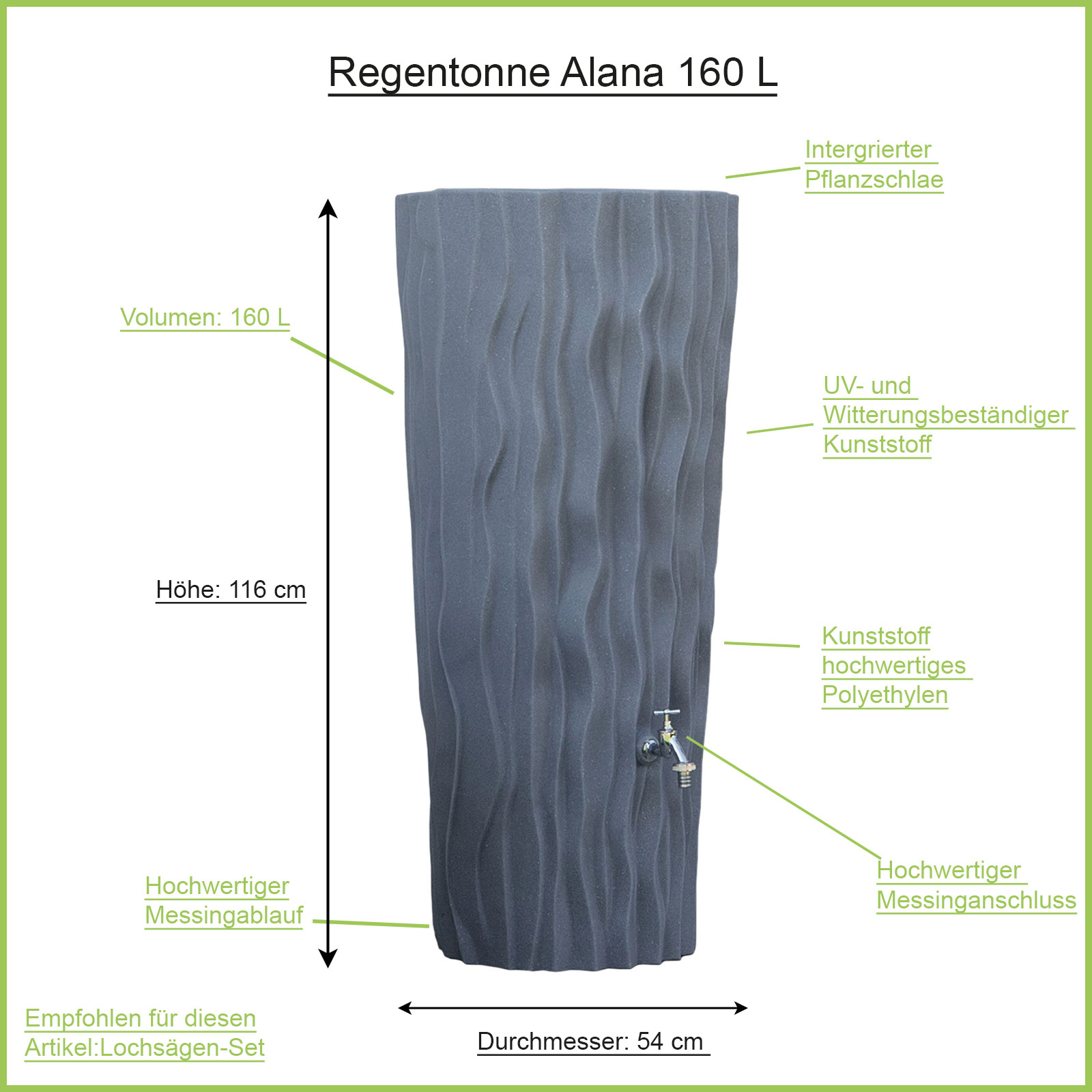 Bereichern Sie Ihren Garten mit der Regentonne Alana grau und erfreuen sich an Ihrer Stilvollen Struktur. Egal ob Balkon bzw. Terasse oder in Ihrem Garten der Regenwassertank wird sich harmonisch in Ihr Gartenbild einfügen. Die integrierte Pflanzschale ermöglicht Ihnen eine Bepflanzung nach Ihren wünschen. Der witterungs- und UV Licht beständige Kunststoff aus dem die Regenwassertonne hergestellt wird, trotz entleert auch der kalten Frostperiode. Mit einem gesamt Volumen von 160 Liter ist die Regentonne für Balkone bzw. auch für Terassen bestens geeignet. Die hochwertigen Messinganschlüsse ermöglichen Ihnen eine einfach Installation vom Auslaufhahn bzw. dem Entnahme-Set.