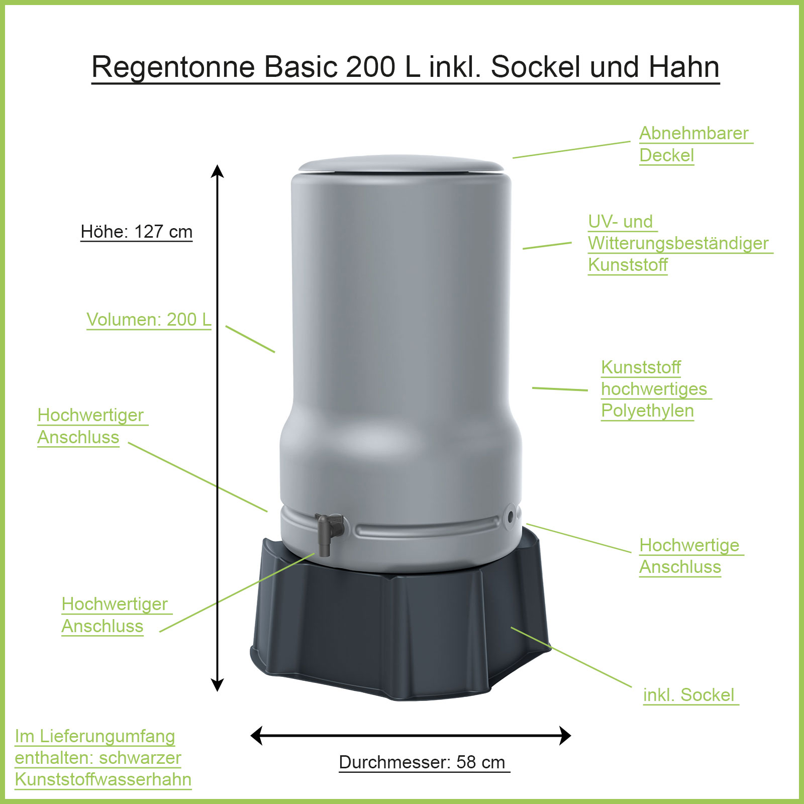 Lieferumfang: Regentonne + Deckel + Sockel + Kst. Hahn schwarz.
