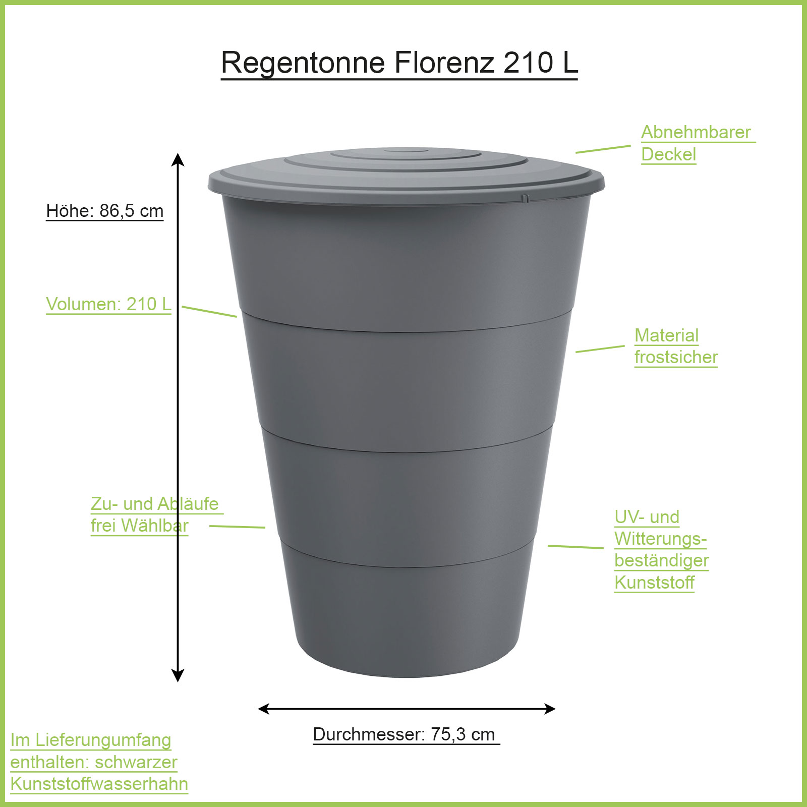Unsere Regentonne Florenz in der Farbe grau mit einem Fassungsvolumen von 210 Litern. Diese eignet sich bestens für das Bewässern von mittlerer Gärten bzw. Terrassen. Der Deckel verfügt über eine Sicherung, die vor unerwünschtem öffnen der Regenwassertonne schützt. Der abnehmbare Deckel ermöglicht es Ihnen das Regenwasser mit einer Gießkanne zu entnehmen. Der Regenwassertank Florenz in grau, lässt sich unauffällig in Ihren bestehenden Garten integrieren und versorgt ihre Blumen bzw. Gemüse mit wertvollem Regenwasser. Die ausgewählte Kunststoffmischung ist sehr UV- und witterungsbeständig, im entleerten Zustand kann selbst die harte bzw. frostige Winterzeit der Regentonne Florenz nichts anhaben. Lassen Sie die alte unschöne Regenwassertonne aus Ihrem Garten verschwinden und freuen sich jeden Tag an Ihrem neuen modernen Florenz 210 l.