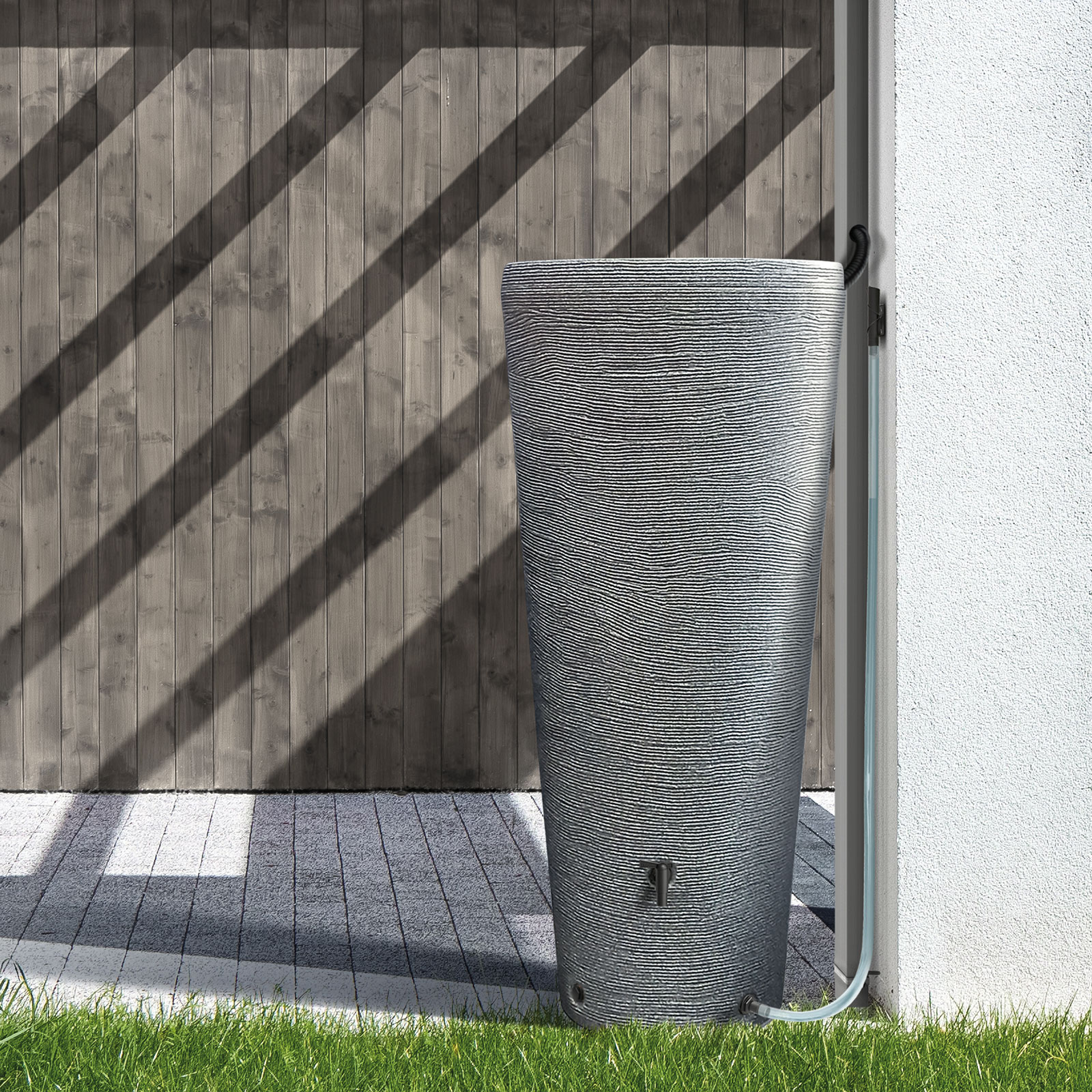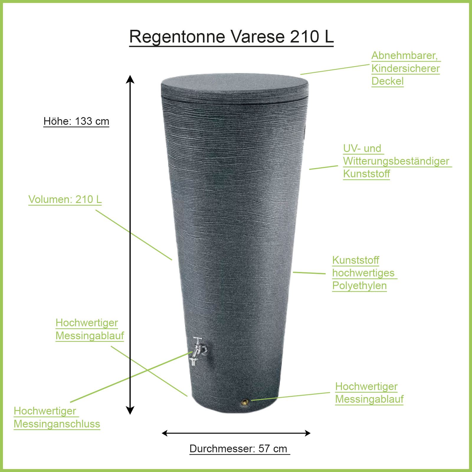 Die Regentonne Varese mit 210 L in granitgrau, ist eine hochmoderne Regenwassertonne, die strukturierte Oberfläche, passt bestens zu der heutigen modernen Architektur. Der Regenwassertank setzt den modernen Still von Ihrem Haus bzw. Garten fort. Die Varese wird Ihnen und Ihren Gästen ein Blickfang verschaffen, der beim gemütlichen Grillen im Garten zum Gesprächsthema wird.Das Reinigen der Regentonne gestaltet sich kinderleicht, dank sei dem abnehmbaren Deckel. Die bereits integrierte ¾ Zoll Messing-Gewinde ermöglichen Ihnen das anschließen von einem Wasserhahn bzw. weiteres Zubehör zum Verbinden oder auch zum kompletten Entleeren der Regenwassertonne. Der hochwertige Kunststoff ist UV bzw. witterungsbeständig und kann im leeren Zustand an Ort und Stelle überwintern. Die Regentonne eignet sich für kleine bzw. mittlere Gärten.