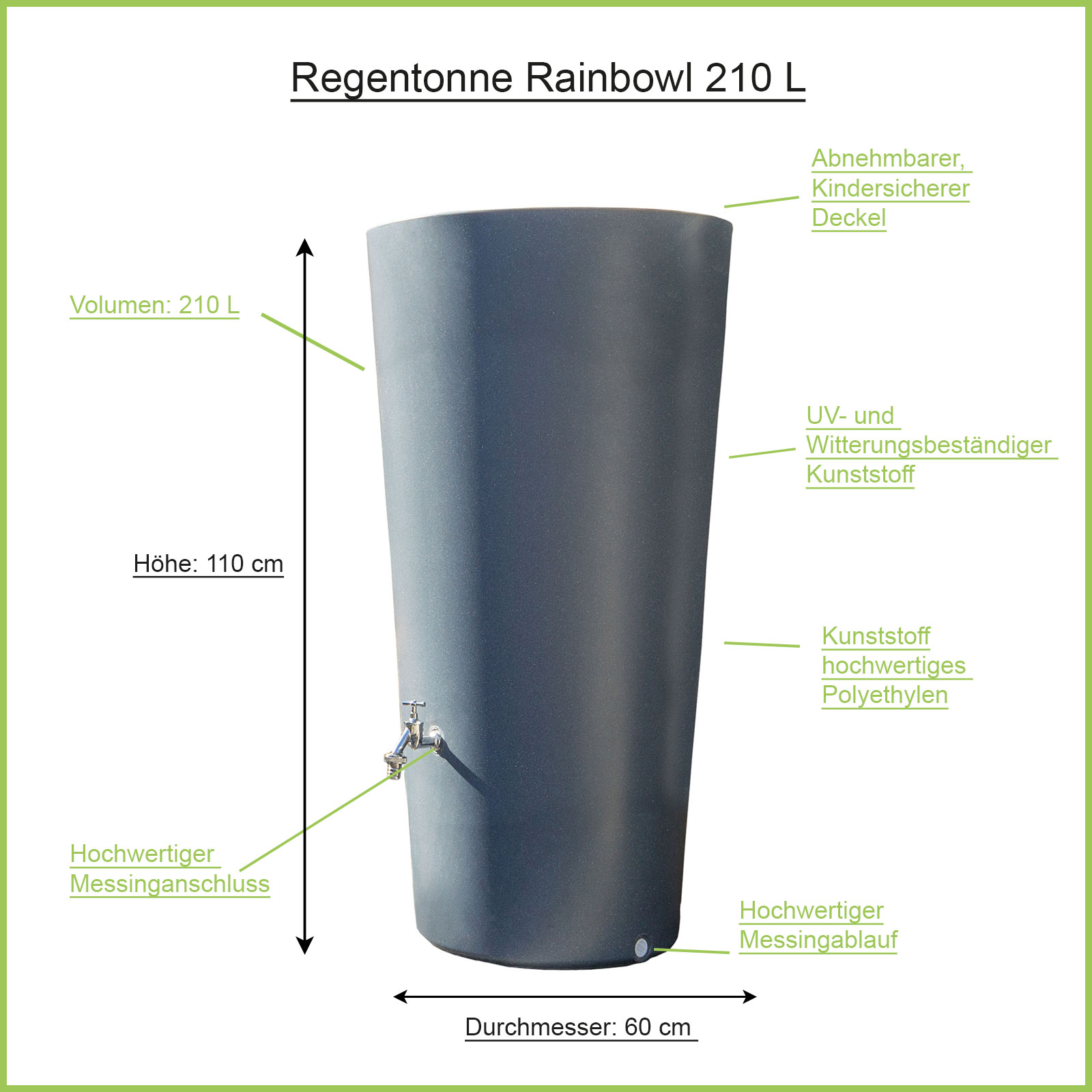 Die Regentonne fasst ein Volumen von 210l Regenwasser.