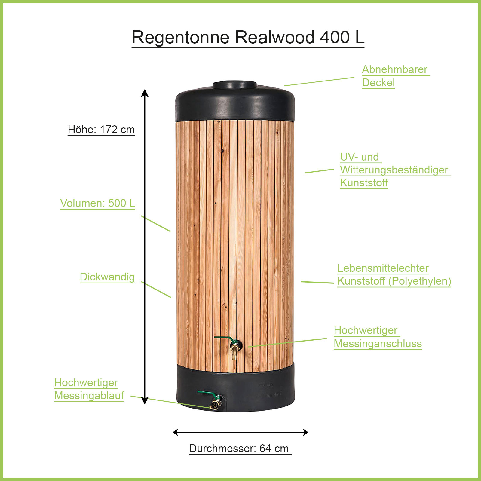 Die Regentonne Holz Realwood 400 Liter vereint stilvoll echtes Holzfass mit robustem und dichtem Kunststoffbehälter für die sichere Aufbewahrung von Regenwasser. Der Säulentank Realwood 400l wird aus hochwertigem Kunststoff (PE) gefertigt und ist dank hoher Wandstärken bestens vor Wind und Wetter geschützt. Mit einem Volumen von 400 Liter speichert die Säulen Regentonne genug Regenwasser für mittelgroße Gärten. Integrierte 3/4 Zoll Gewinde aus Messing ermöglichen ein schnelles Anbringen von Wasserhahn und Co. Auch das Verbinden mehrerer Regentonnen ist mit unserem Verbindungs-Set jederzeit möglich. Darüber hinaus kann die Regentonne Realwood über den zweiten Auslass vor dem Winter sehr leicht entleert werden. Steigen Sie noch heute auf die moderne und stilvolle Art der Regenwassernutzung um und erfreuen Sie sich bereits in wenigen Tagen an Ihrer neuen Regenwassertonne mit schöner Holzverkleidung.