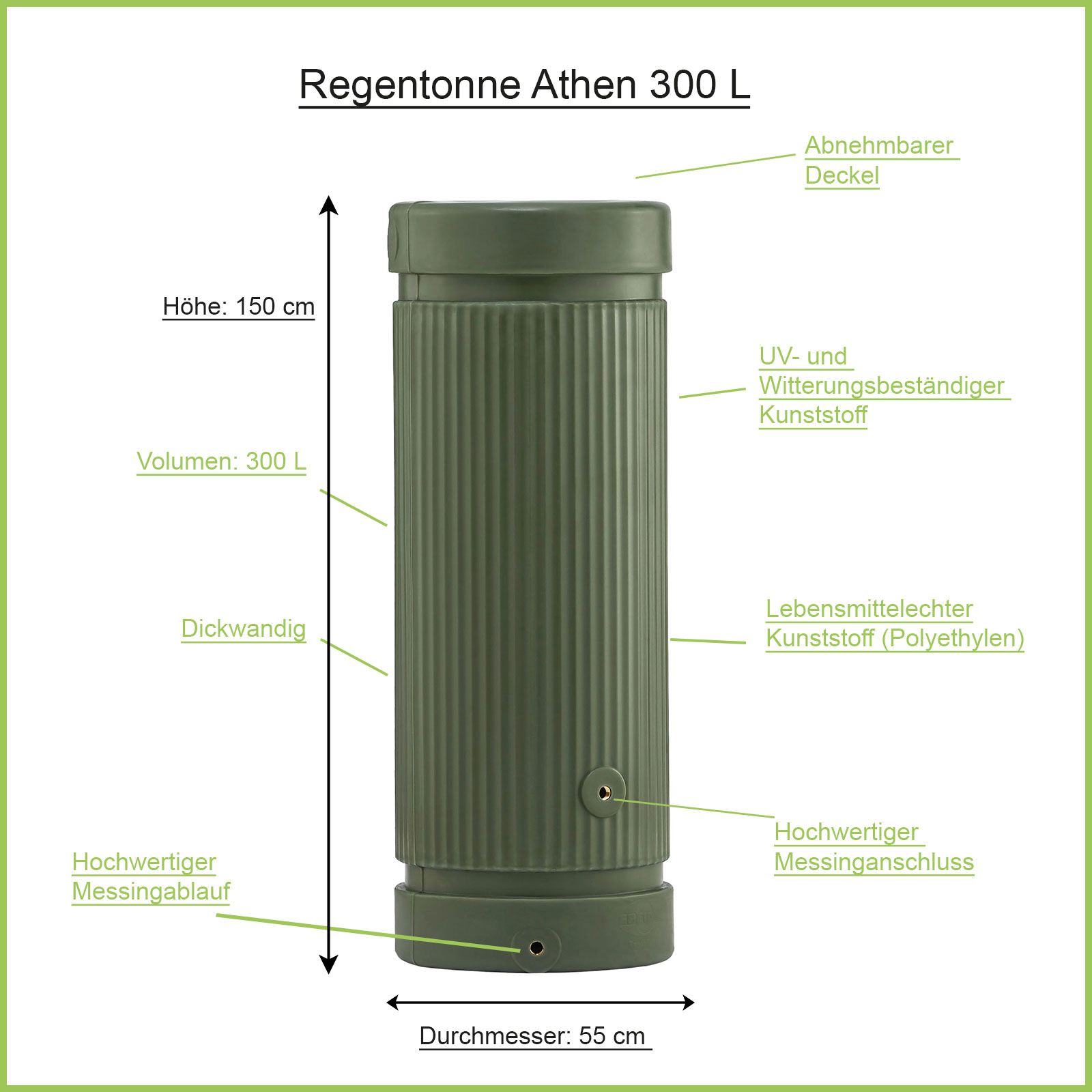 Art.-Nr.: 08319Die Regensäule grün Athen speichert 300 Liter an wertvollem Regenwasser für die Gartenbewässerung. Dank der innovativen Säulenform nimmt die Regentonne eine sehr geringe Standfläche von gerade mal 55 x 55 cm ein. Der Säulentank besitzt zwei integrierte 3/4 Zoll Messing-Gewinde – perfekt für unsere Wasserhähne und weiteres Zubehör. Auch das Verbinden mehrere Säulen für mehr Volumen ist möglich.