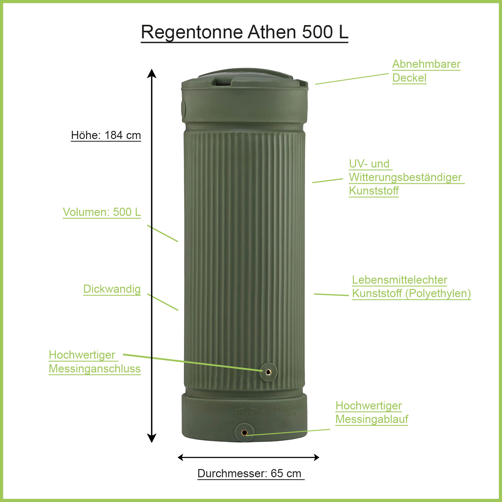 Art.-Nr.: 08245Die Regensäule grün Athen speichert 500Liter an wertvollem Regenwasser für die Gartenbewässerung. Dank der innovativen Säulenform nimmt die Regentonne eine sehr geringe Standfläche von gerade mal 65 x 65 cm ein. Der Säulentank besitzt zwei integrierte 3/4 Zoll Messing-Gewinde – perfekt für unsere Wasserhähne und weiteres Zubehör. Auch das Verbinden mehrere Säulen für mehr Volumen ist möglich.