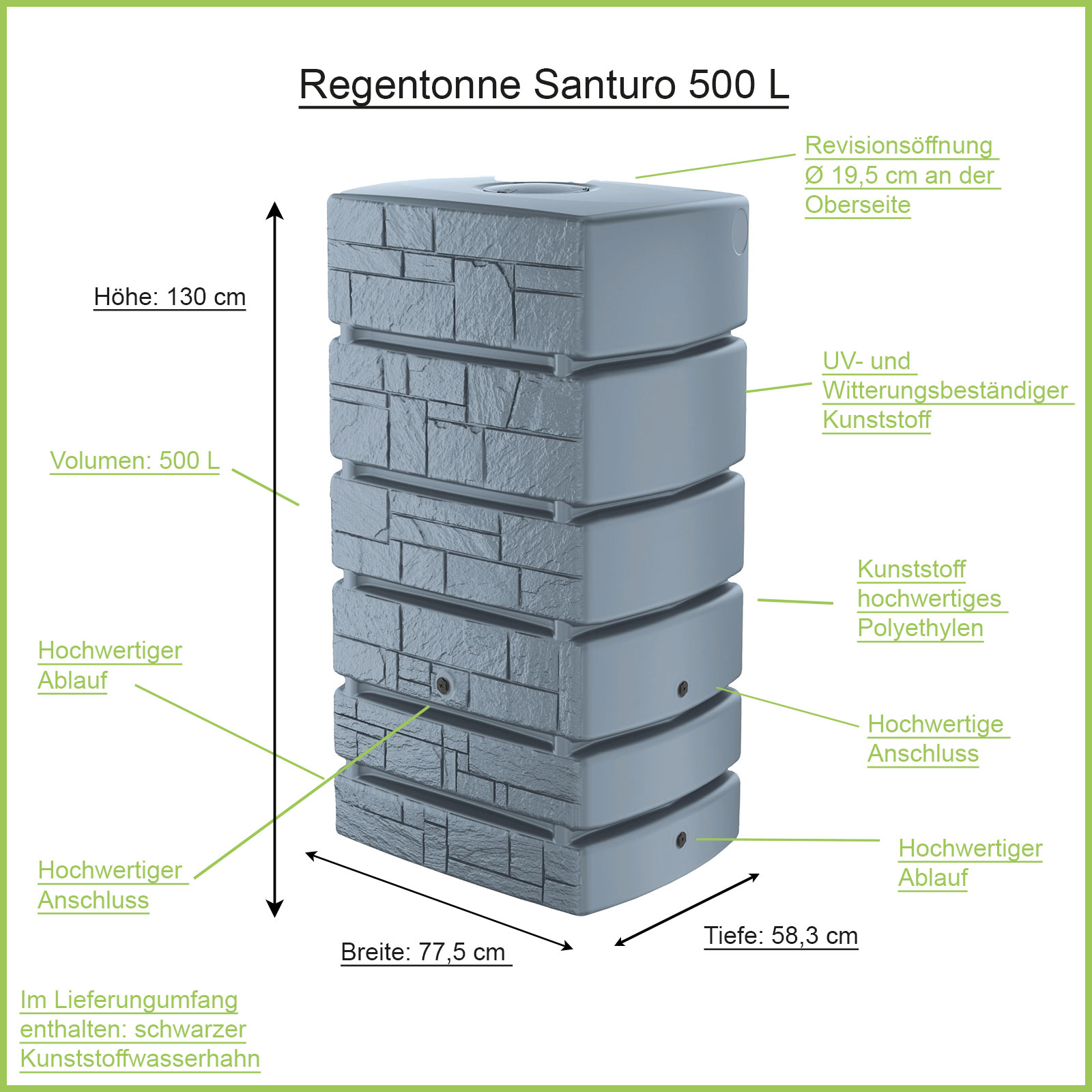 Die Regentonne eckig Santuro, ist der perfekte Wandtank für einen modernen, mit Still angelegter Garten. Der hochwertige Verarbeitete Kunststoff trotzt den kräftigen UV-Strahlen, im entleerten Zustand können Sie die Regentonne grau 500 Liter ohne bedenken überwintern lassen. Die moderne Oberflächenstruktur ähnelt einer von Hand gemauerten Schiefern Mauer zum Verwechseln. Egal wo Sie in Ihrem Garten die Regenwassertonne eckig bzw. Wandtank eckig aufstellen werden, sie wird immer die Blicke auf sich ziehen und Ihr Gartenbild mit einem Eye Catcher versehen. Die geringe Standfläche von 77,5 cm x 58,3 cm ist ein weiterer Vorteil der Regentonne eckig. Die eingelassene ¾ Zoll Gewinde ermöglichen Ihnen einen einfachen Anschluss eines Wasserhahns bzw. auch das Verbinden von mehreren Regentonnen. Die 500 L Regenwasser sind die ideale Menge für einen mittel großen Garten.