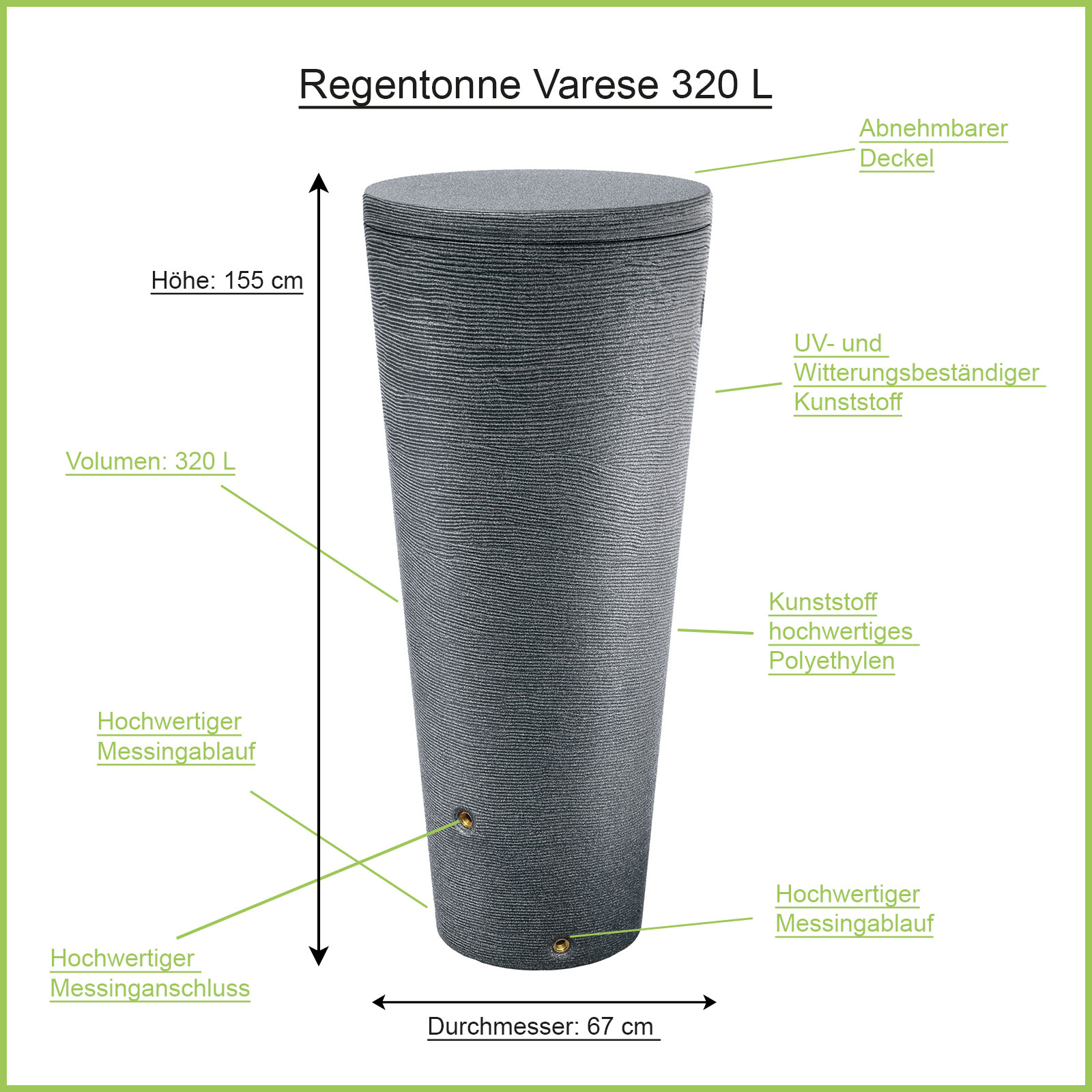 Die Regentonne Varese mit 320 L in granitgrau, ist eine hochmoderne Regenwassertonne, die strukturierte Oberfläche, passt bestens zu der heutigen modernen Architektur. Der Regenwassertank setzt den modernen Still von Ihrem Haus bzw. Garten fort. Die Varese wird Ihnen und Ihren Gästen ein Blickfang verschaffen, der beim gemütlichen Grillen im Garten zum Gesprächsthema wird.Das Reinigen der Regentonne gestaltet sich kinderleicht, dank sei dem abnehmbaren Deckel. Die bereits integrierte ¾ Zoll Messing-Gewinde ermöglichen Ihnen das anschließen von einem Wasserhahn bzw. weiteres Zubehör zum Verbinden oder auch zum kompletten Entleeren der Regenwassertonne. Der hochwertige Kunststoff ist UV bzw. witterungsbeständig und kann im leeren Zustand an Ort und Stelle überwintern. Die Regentonne eignet sich für kleine bzw. mittlere Gärten.