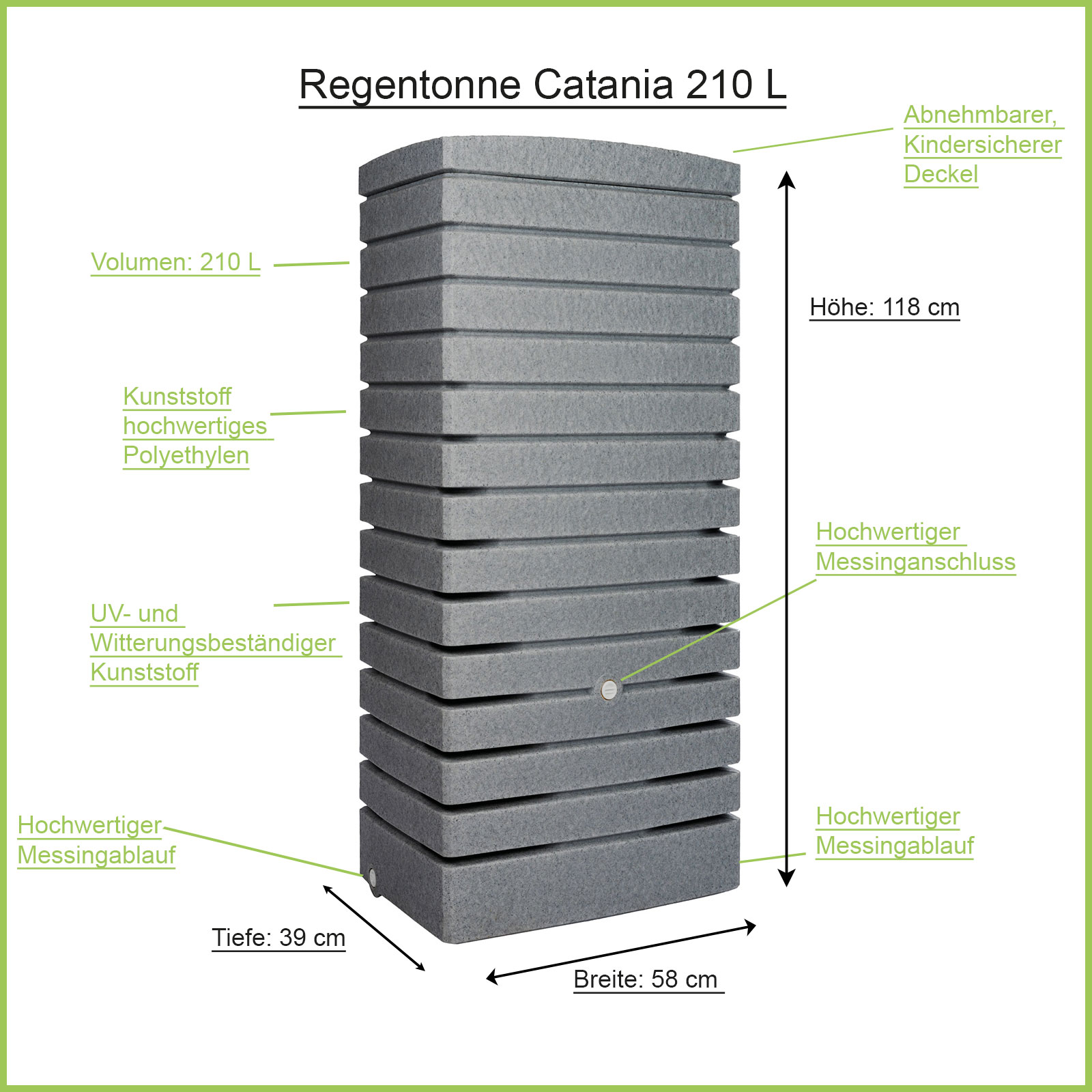 Art.-Nr.: F900300Die Regentonne anthrazit Catania ist ein Wandtank in Steinoptik. In Anlehnung an edle Granit Mauersteine fasst die Regenwassertonne bis zu 210 Liter Regenwasser für den Garten. Die Regentonne eckig ist mit einer schmalen Standfläche von 58 x 39 cm ideal für die Platzierung an der Hauswand geeignet. Der Catania hat drei hochwertige ¾-Zoll-Messinggewinde für den Wasserhahn, den Abfluss und den Anschluss eines zweiten Tanks.