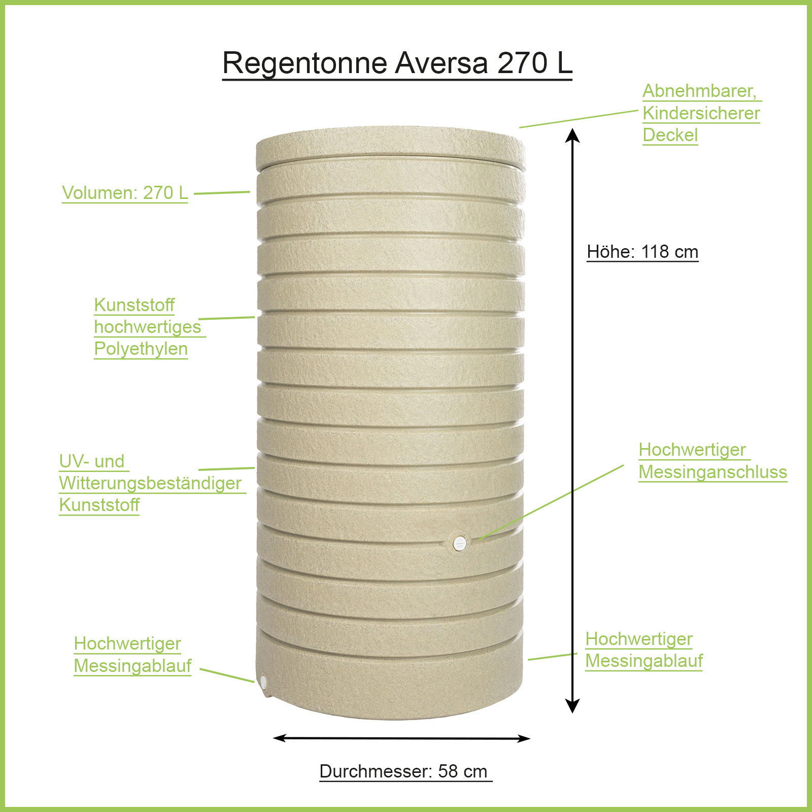 Art.-Nr.: F900420Die Regentonne Aversa 270 Liter in der Farbe Sandstein ist eine stilvolle Regenwassertonne, die optisch an Granit Mauerstein erinnert. Der runde Behälter ist ein stilsicheres Accessoire für Garten und Terrasse. Die Regentonne verfügt über drei 3/4-Zoll-Gewinde für einen Wasserhahn und die Entleerung im Winter. Die runde Regentonne wird mit einem kindersicheren Deckel geliefert und benötigt eine sehr geringe Standfläche von 58 x 58 cm.