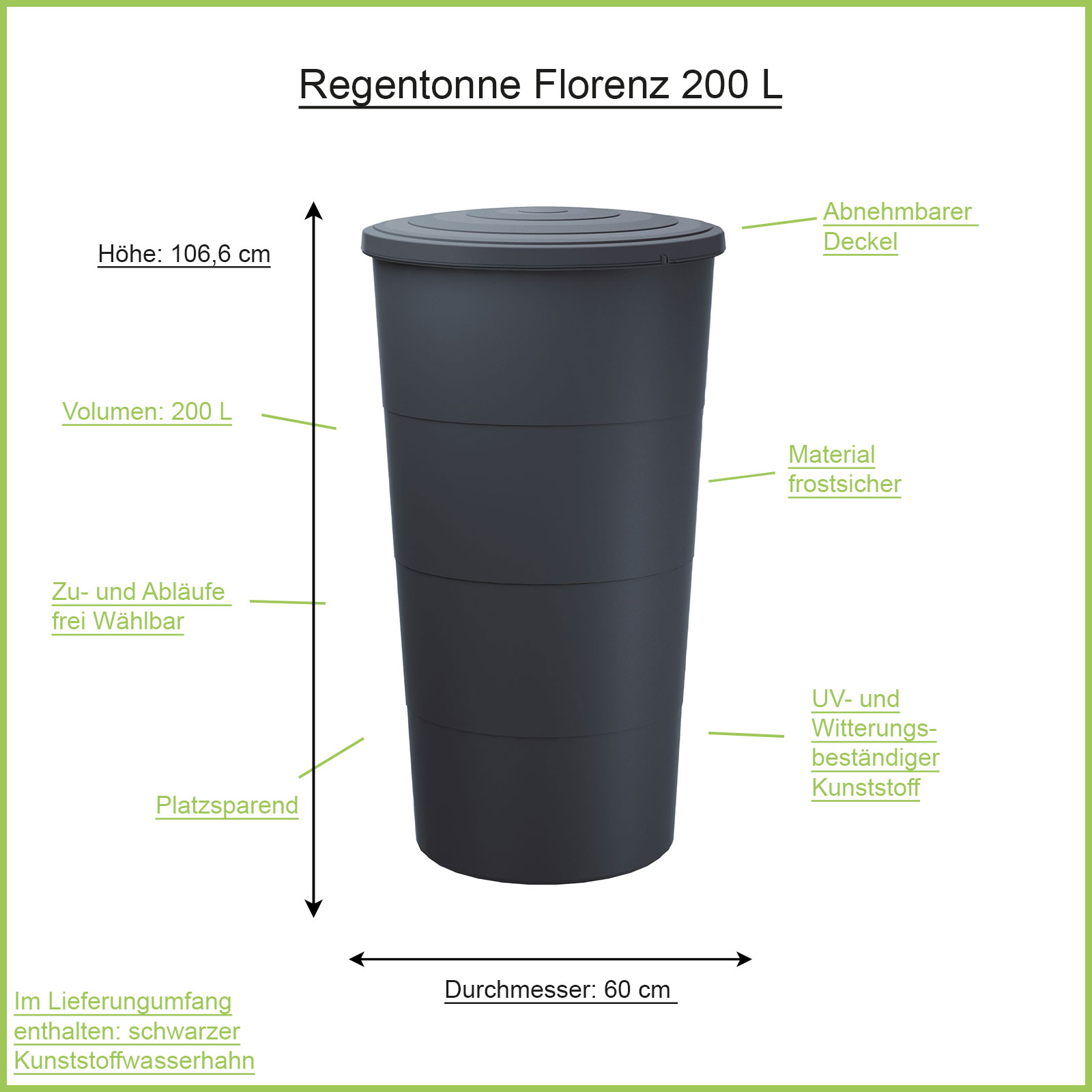 Unsere Regentonne Florenz in der Farbe anthrazit mit einem Fassungsvolumen von 200 Litern. Diese eignet sich bestens für das Bewässern von kleinen Gärten bzw. Terrassen. Der Deckel verfügt über eine Sicherung, die vor unerwünschtem öffnen der Regenwassertonne schützt. Der abnehmbare Deckel ermöglicht es Ihnen das Regenwasser mit einer Gießkanne zu entnehmen. Der Regenwassertank Florenz in anthrazit, lässt sich unauffällig in Ihren bestehenden Garten integrieren und versorgt ihre Blumen bzw. Gemüse mit wertvollem Regenwasser. Die ausgewählte Kunststoffmischung ist sehr UV- und witterungsbeständig, im entleerten Zustand kann selbst die harte bzw. frostige Winterzeit der Regentonne Florenz nichts anhaben. Lassen Sie die alte unschöne Regenwassertonne aus Ihrem Garten verschwinden und freuen sich jeden Tag an Ihrem neuen modernen Florenz 200 l.