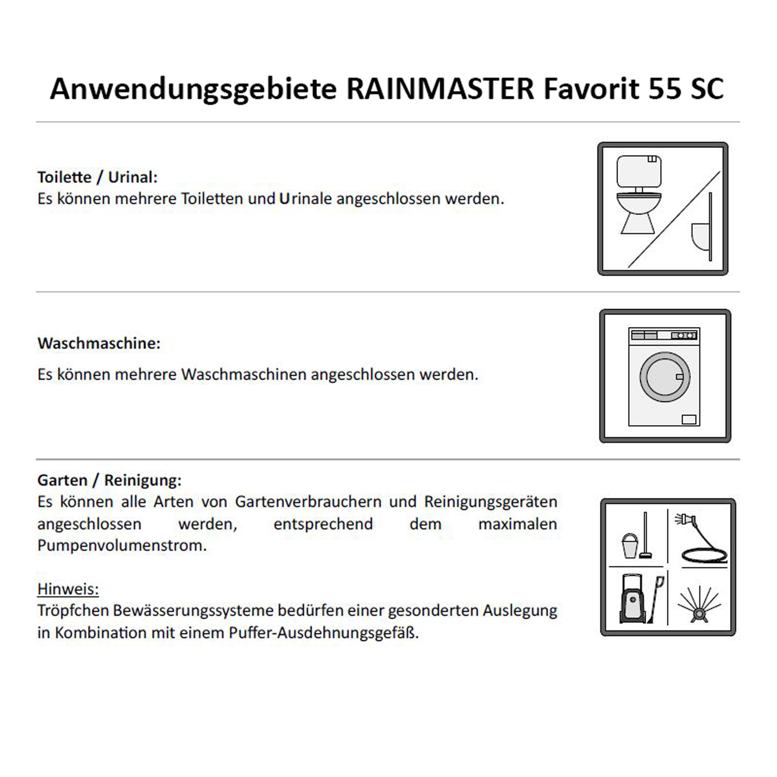 Das Regenwasser wird über den Saugschlauch aus der Zisterne angesaugt und eignet sich für die Gartenbewässerung, die Toilettenspülung und die Waschmaschine, sowie für Bewässerungs- und Reinigungsanlagen. Wenn nicht genügend Regenwasser vorhanden ist, versorgt der RAINMASTER Favorit 55 SC die Verbraucher automatisch über die integrierte, zertifizierte Nachspeisung mit dem Trinkwasser. Der RAINMASTER Favorit 55 SC kann im Keller, in der Garage oder in einem erdgeschossigen Raum installiert werden. Der RAINMASTER Favorit 55 SC ist mit der NUVOS Pumpentechnologie, einem hoch effizienten Permanentmagnetmotor mit Inverter Technologie ausgestattet. Dies führt zu sehr geringem Stromverbrauch, geringer Geräuschentwicklung und langer Lebensdauer. Weitere Eigenschaften, wie die Druckeinstellbarkeit, der Anti-Frost-, der Trockenlauf- und der Temperaturschutz, machen den RAINMASTER Favorit 55 SC zu dem perfekten Baustein für die Regenwassernutzung.