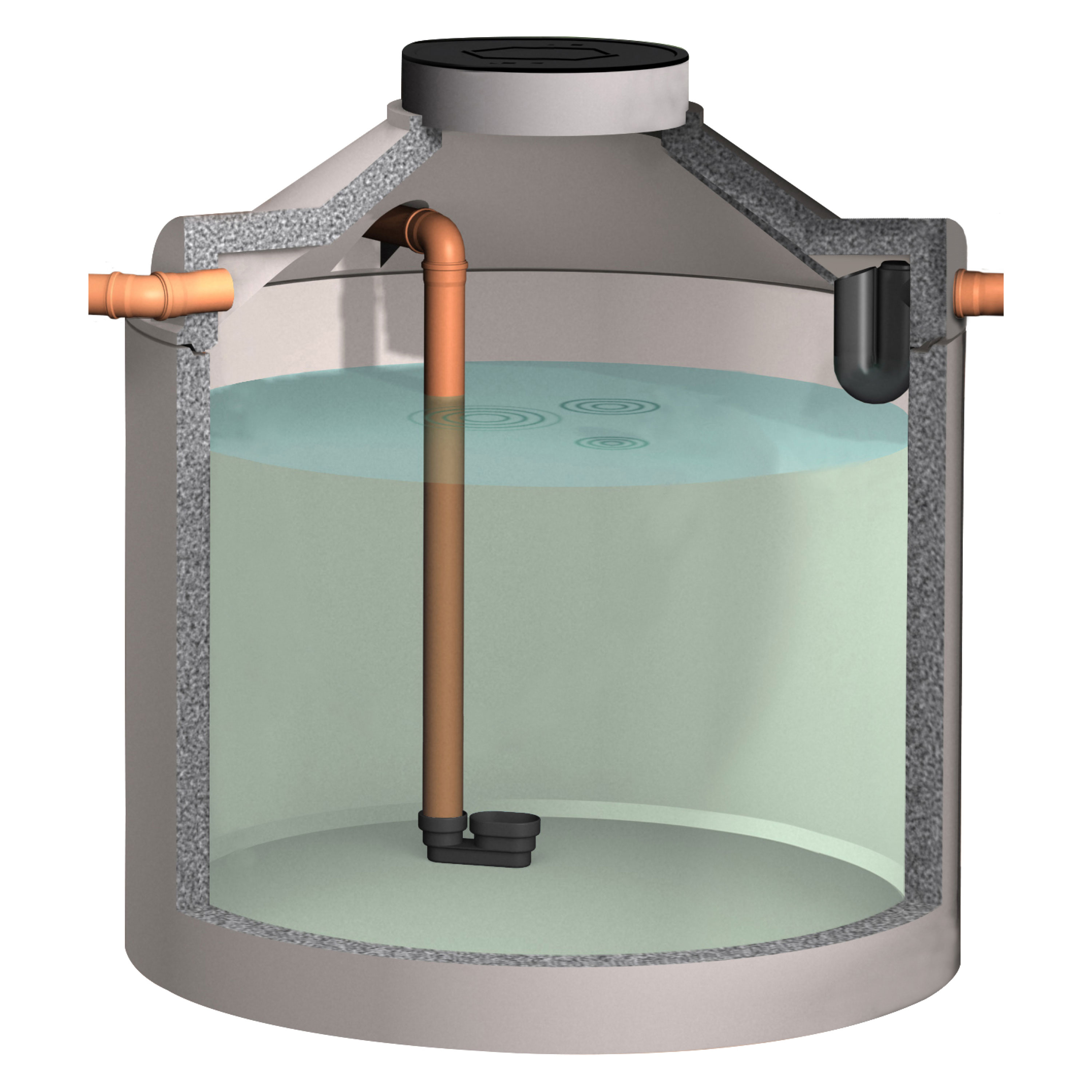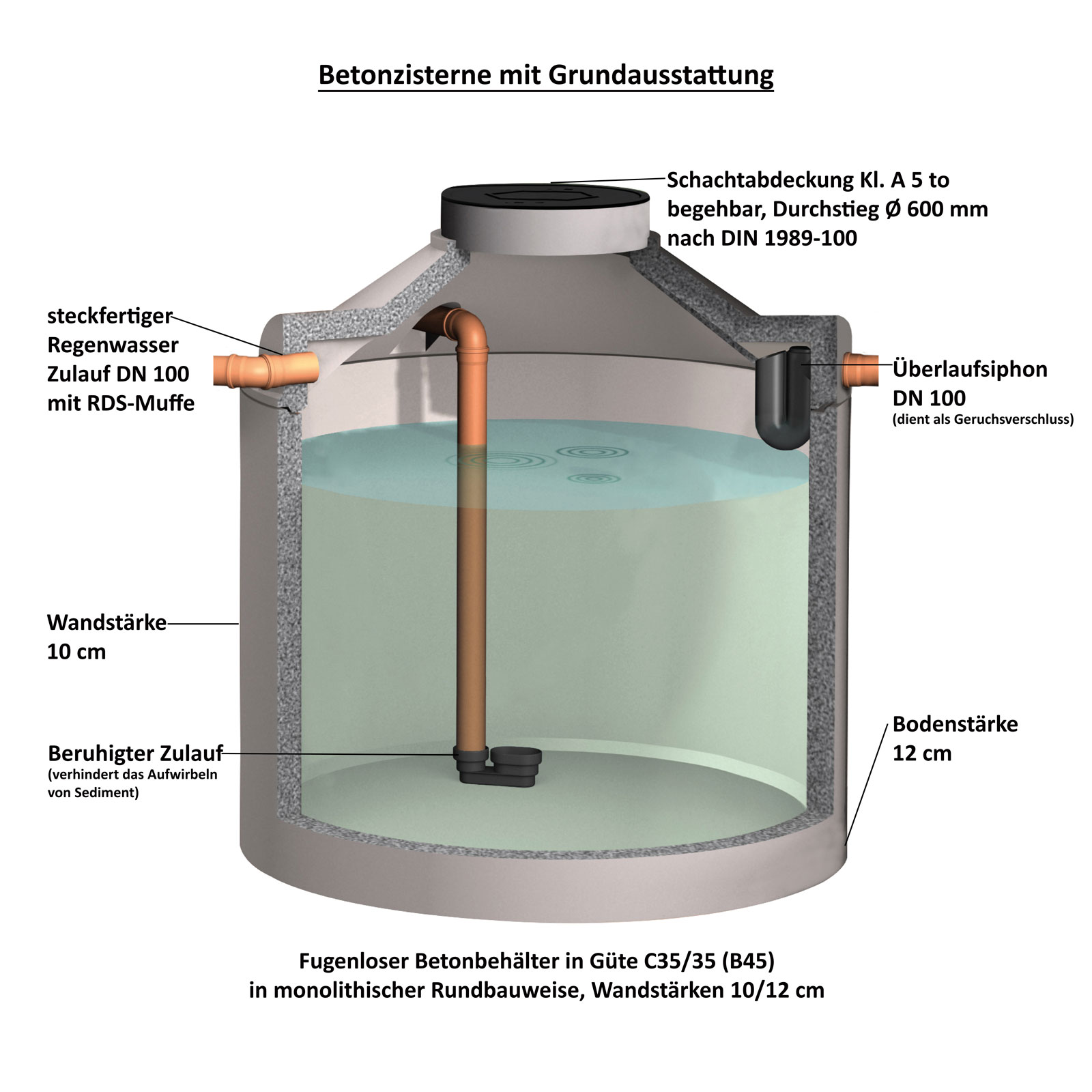 Das Grundpaket beinhaltet einen beruhigten Zulauf welcher dafür sorgt, dass beim Einströmen des Regenwassers das Sediment nicht aufgewirbelt wird. Gleichzeitig wird Sauerstoff in den unteren Bereich der Zisterne geleitet was die Wasserqualität erheblich verbessert. Weiterhin einen Überlaufsiphon mit Nagetiersperre welcher als Geruchsverschluss dient und beim Überlaufen der Zisterne die Schwimmstoffe auf der Wasseroberfläche ableitet.